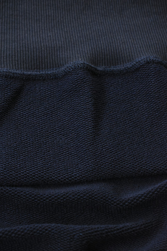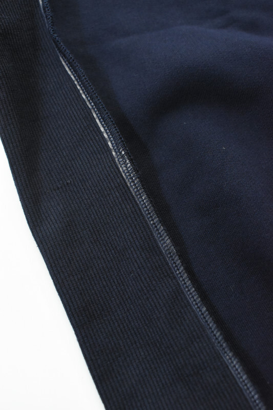 脇のリブは通常とは裏表反対のインサイドアウトで仕上げ、縫い目に沿って透明な縫い留めテープを配することで、
