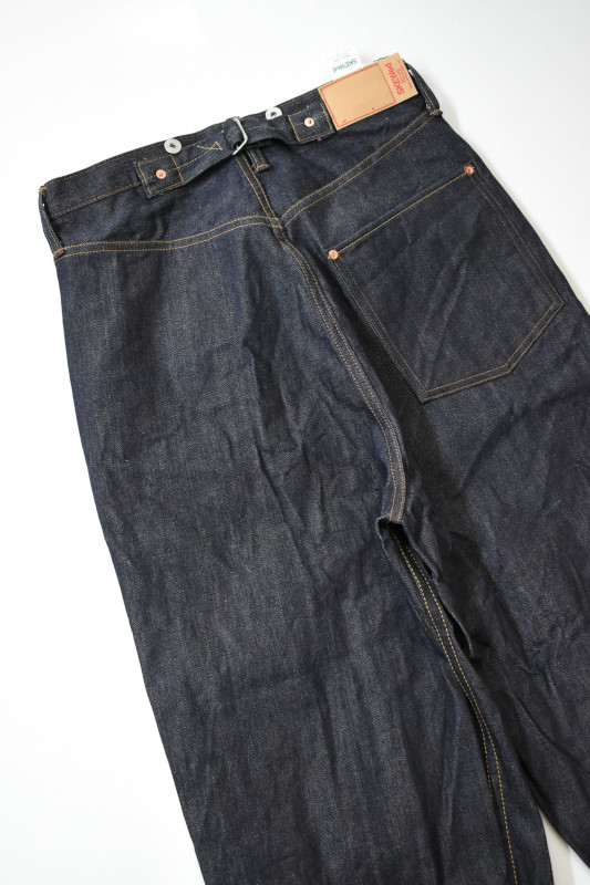 ヒップポケットは片側のみ、シンチバックやサスペンダーボタンなど細部にまで拘っています。