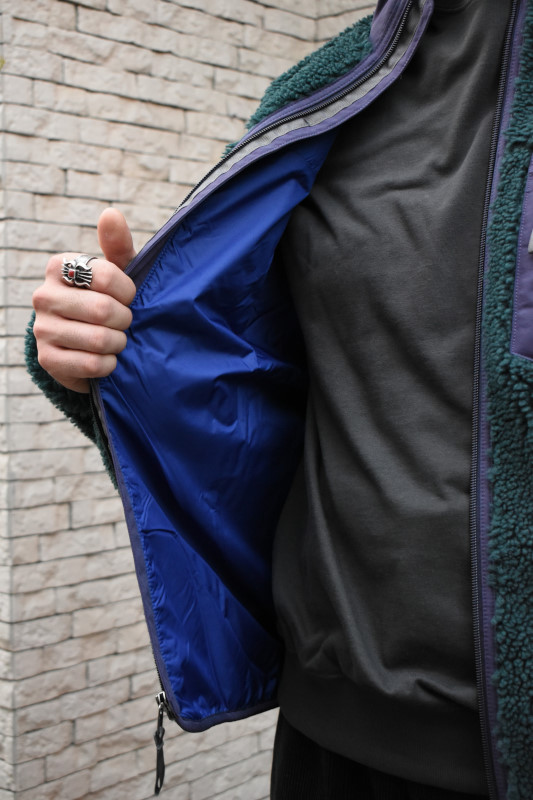 リサイクル・ポリエステル100%の起毛トリコットの裏地を施したジッパー式ハンドウォーマーポケットが2つ。