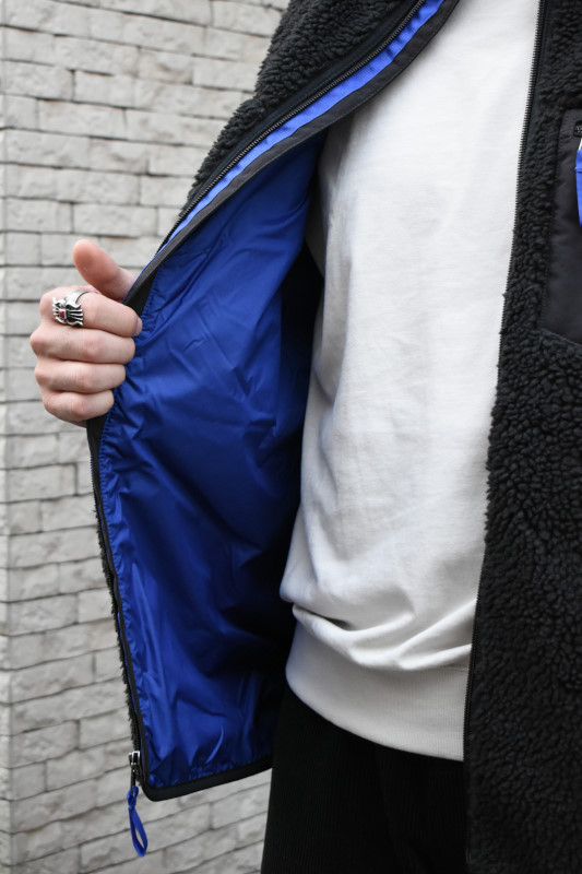 リサイクル・ポリエステル100%の起毛トリコットの裏地を施したジッパー式ハンドウォーマーポケットが2つ。
