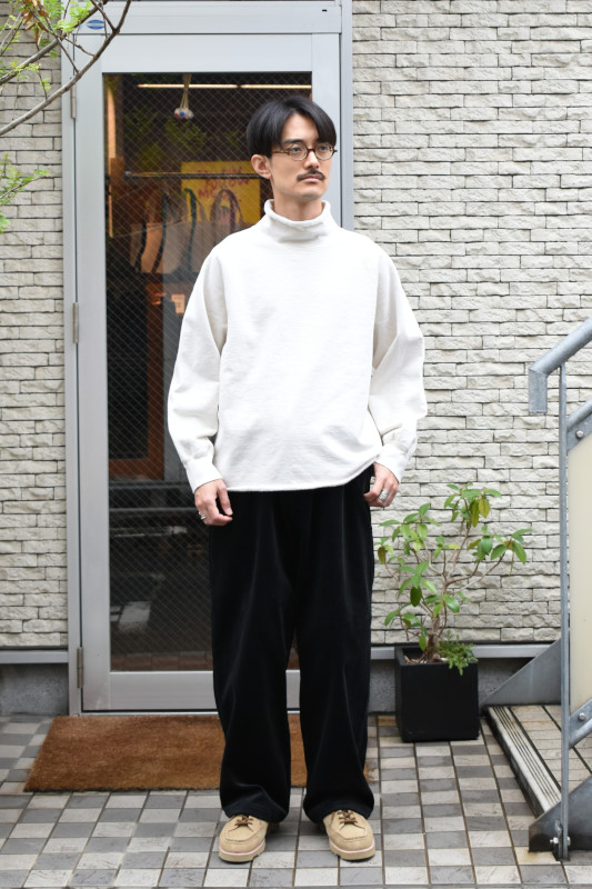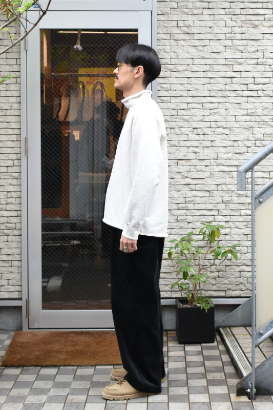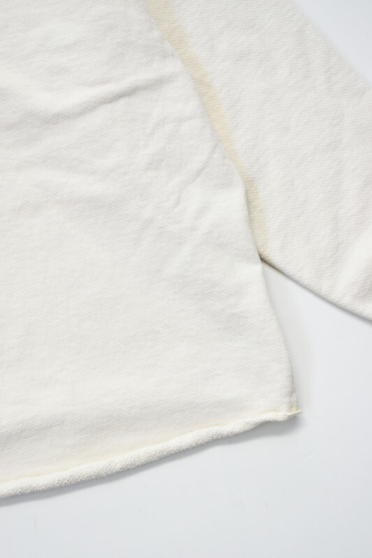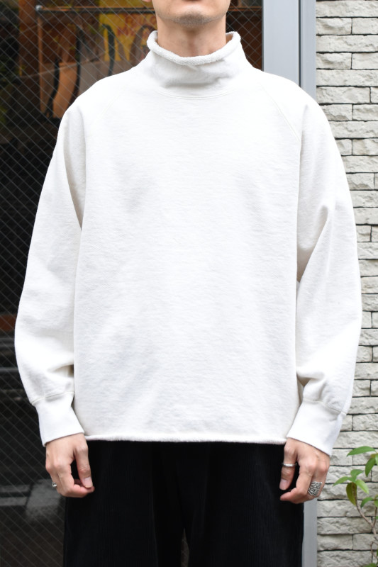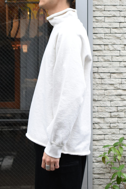 ヘビーオンスのコットン生地を用いた特徴的なロールネック仕様のスウェット。