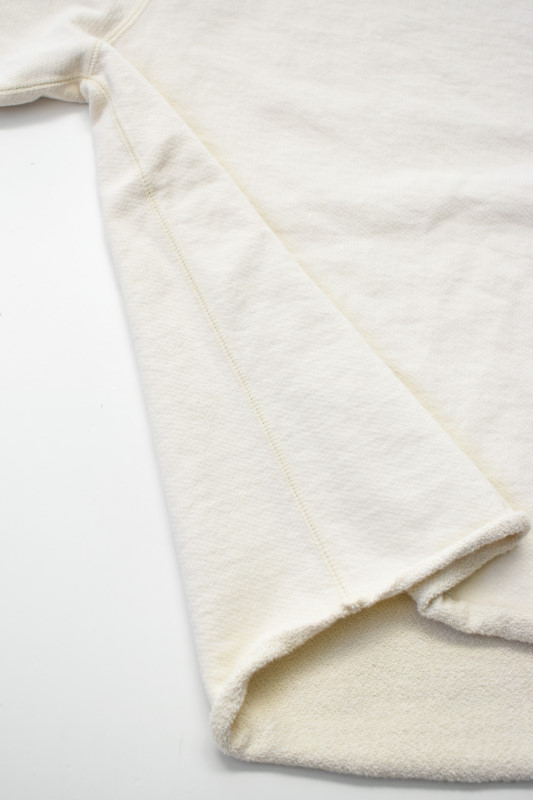 裾は切りっぱなし仕様でリブが付いていないことにより、通常のスウェットのようなふくらみのあるシルエットではなく、