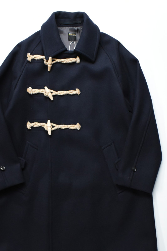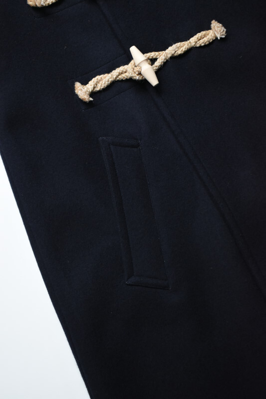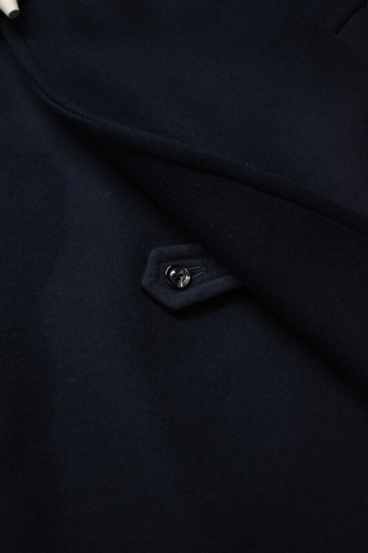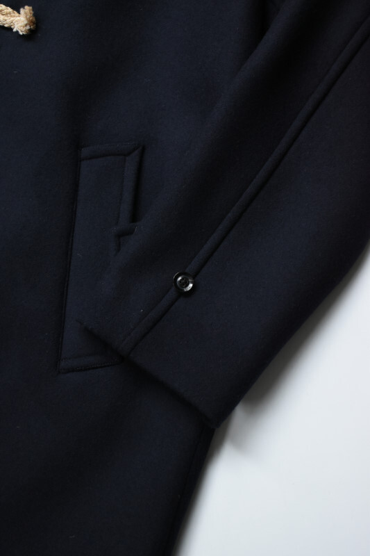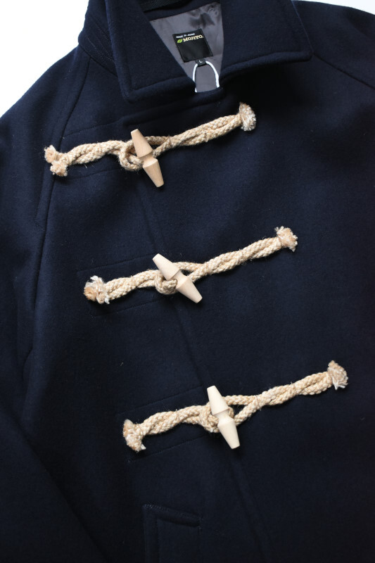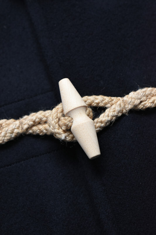 フロントは木製のトグルとロープで構成し、どこか粗野で武骨な雰囲気が生地の上質さとコントラストに。