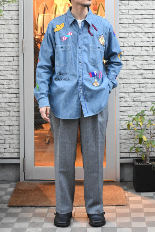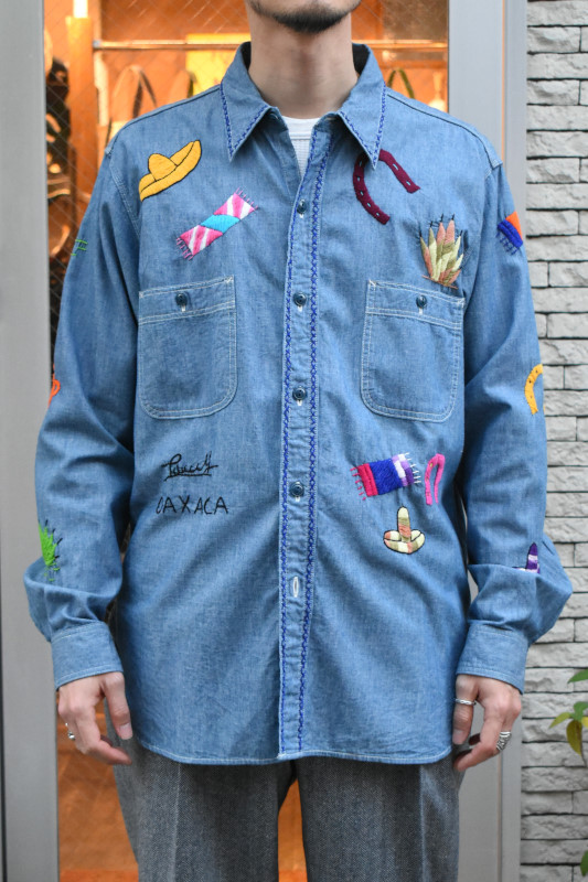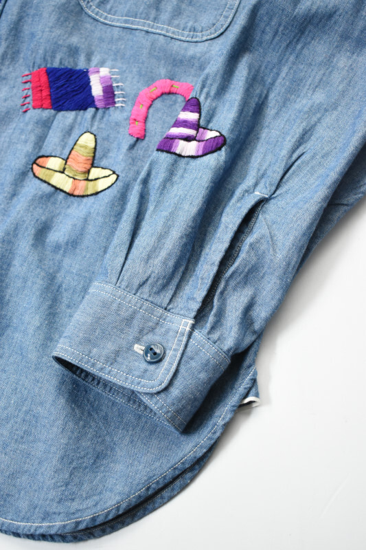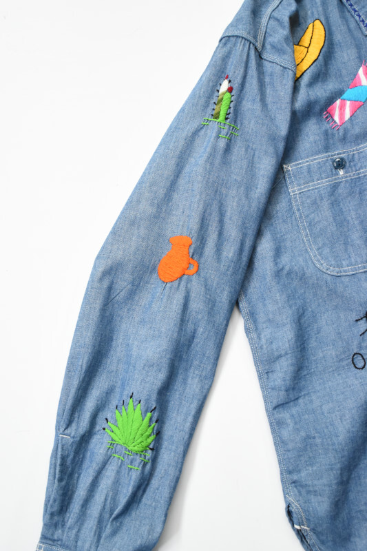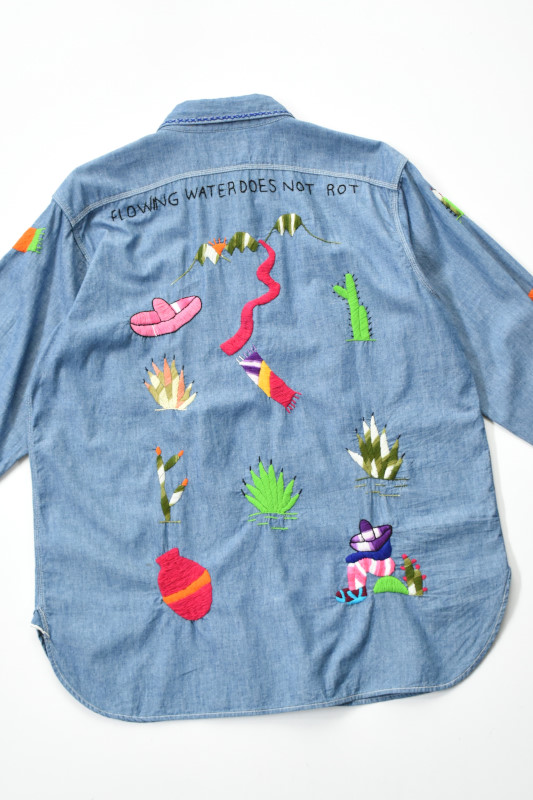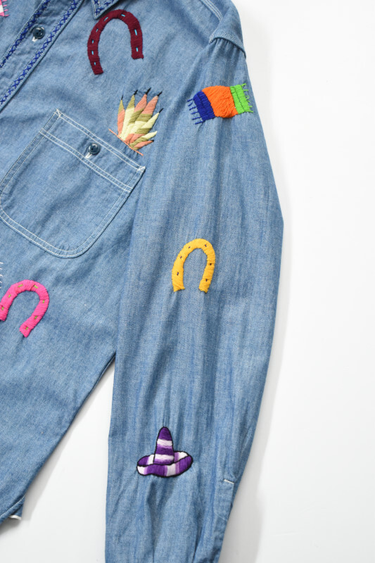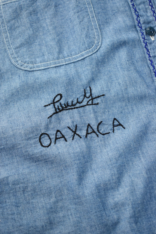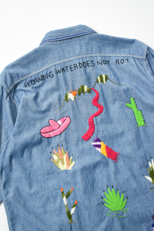 "OAXACA / オアハカ" の刺繍アーティスト Lucy による、刺繍が施されたシャンブレーシャツ。