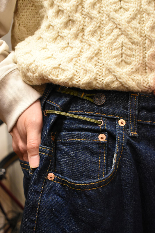 アメリカ軍のパラコードを使用して、ウエスト部分にタックボタンでアジャスターカスタムしたユニークなリメイクデニムです。