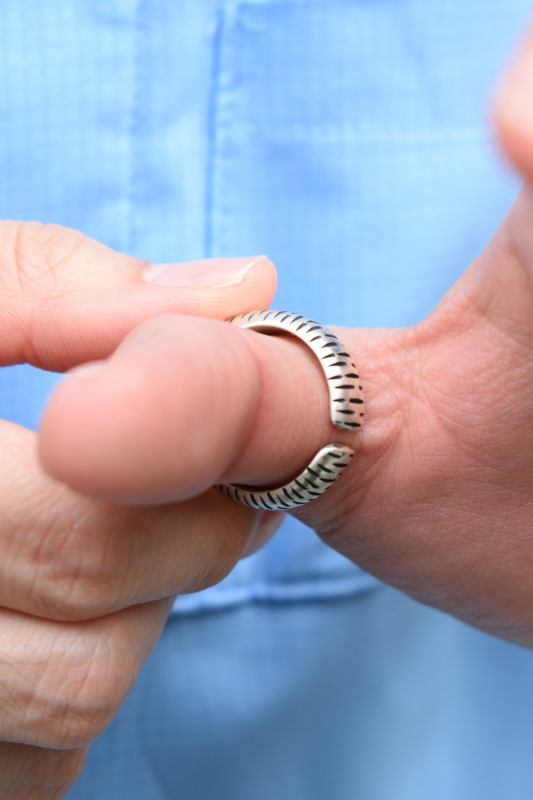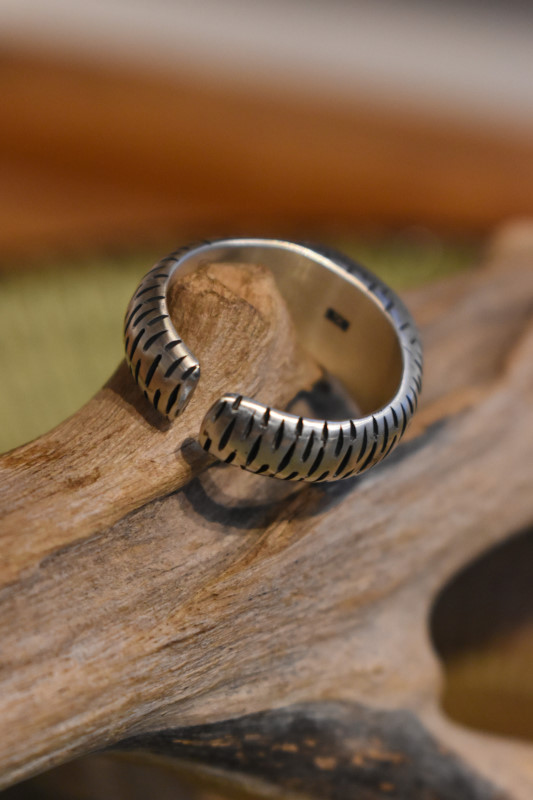 オープンエンドのシグネットリングをベースに、大胆に "飛び鉋" にインスパイアされたスタンプワークを施しました。