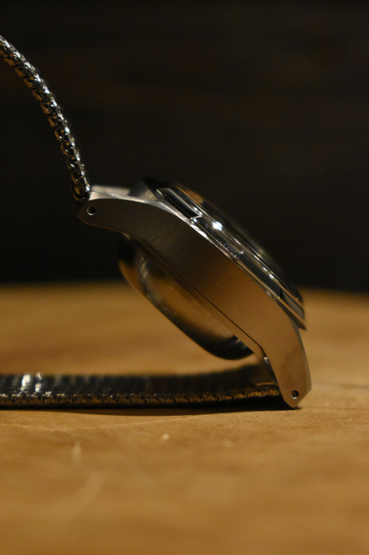 側面と裏蓋はヘアライン仕上げ、ベゼルは鏡面仕上げにして立体感を演出しています。