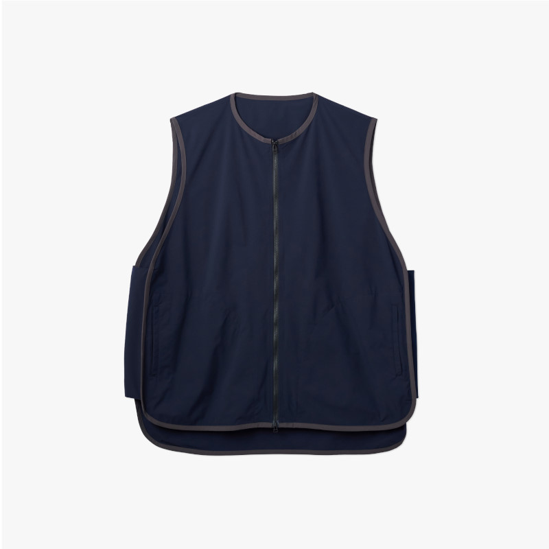 ボリューム感のあるボックスシルエットで仕立てた、クルーネック仕様のジッパーベスト。