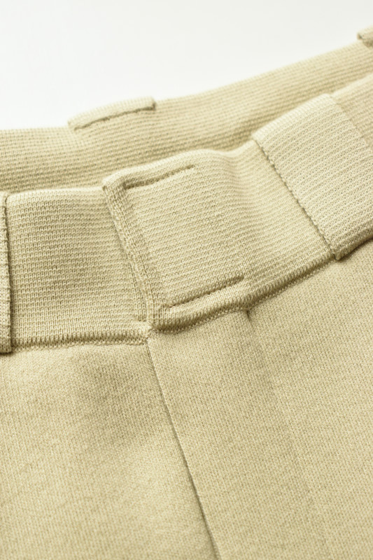 アイコンともいえる太めのベルトループはミラノリブで伸びないようにしっかりと編み立てました。