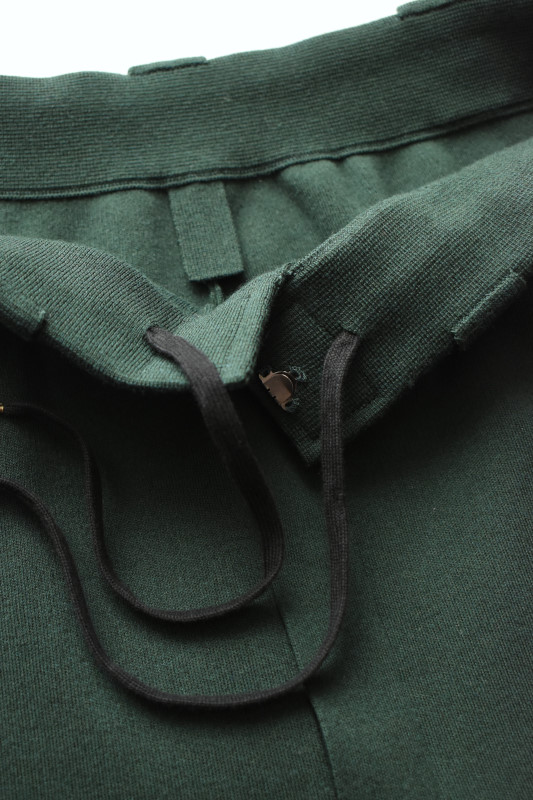 アイコンともいえる太めのベルトループはミラノリブで伸びないようにしっかりと編み立てました。