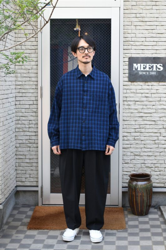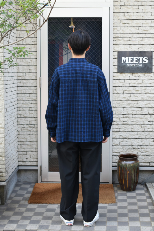 薄く軽い着心地を追求したストレッチ性のあるチェック生地に製品染めを施すことで、独特な表情に。